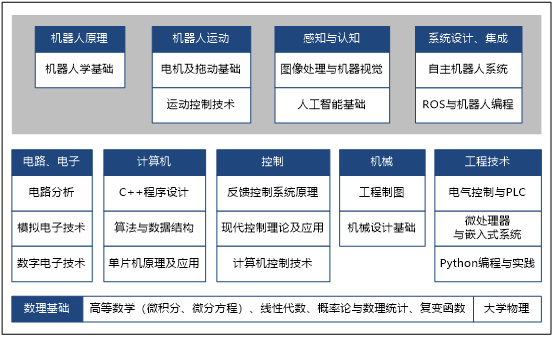 专业主要课程涵盖了支撑机器人工程所需的电气与电子、控制、计算机、机械等交叉领域的基础理论和工程技术,进而学习智能机器人系统设计、开发和应用所需的机器人学、运动控制、图像处理与机器视觉、人工智能技术、机器人软件编程等方面的专业知识。课程体系如图所示。
