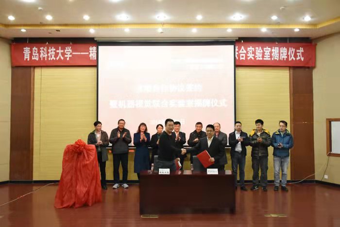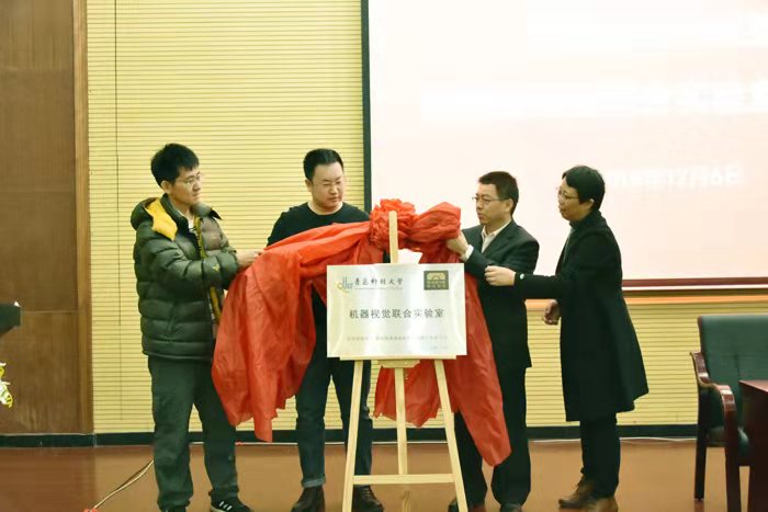 仪式上,吕万翔和孔庆杰在合作协议上签字,并与全球最大顶级体育平台、机器人公司经理刘喜梅,精锐视觉公司技术总监孙旭光一起为“机器视觉联合实验室”揭牌。