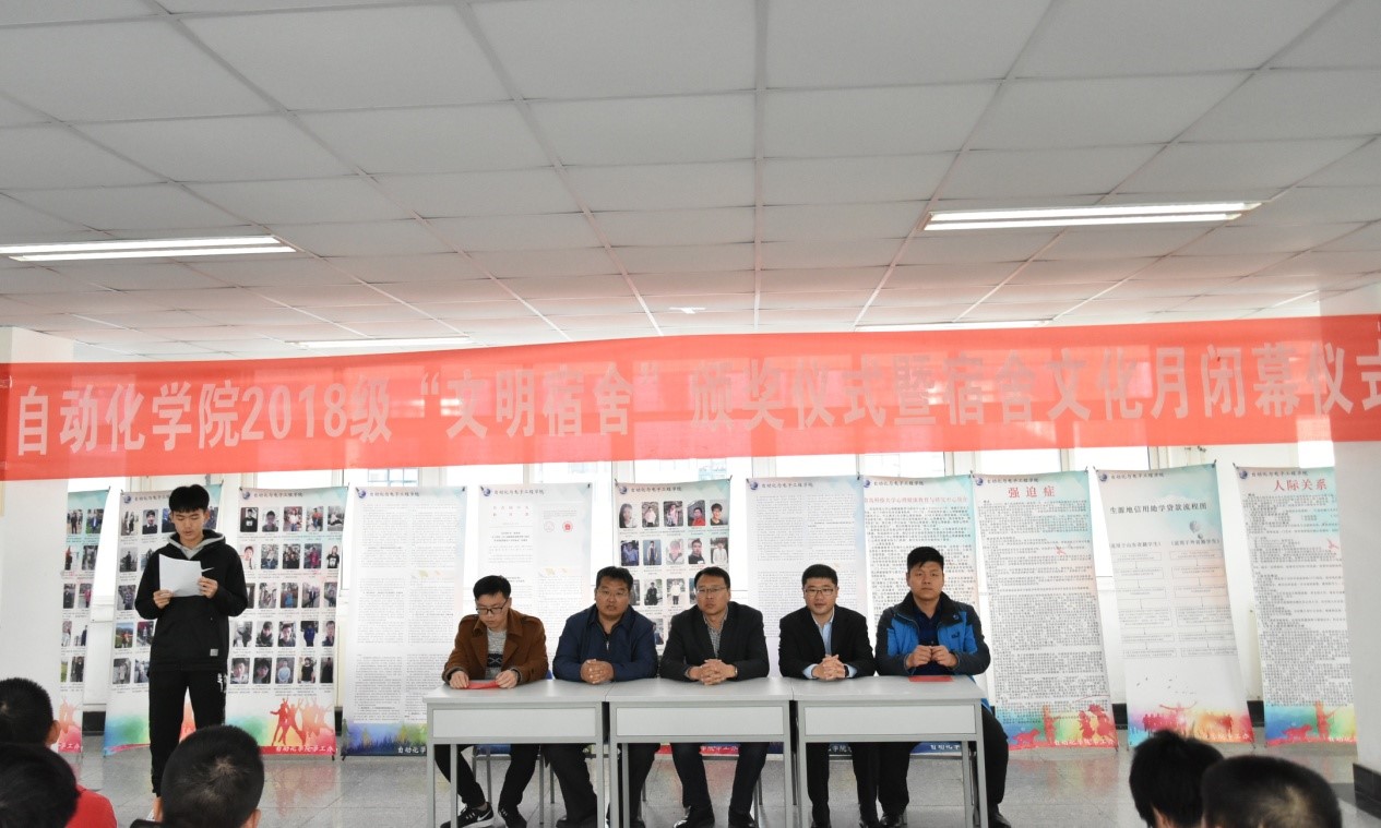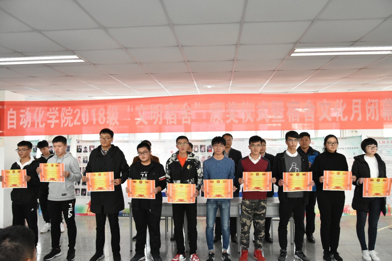 通过为期四周的评比选拔,20个文明宿舍和“十佳舍长”脱颖而出,贺炜、马寒等与会嘉宾为获奖人员颁发锦旗和奖状。