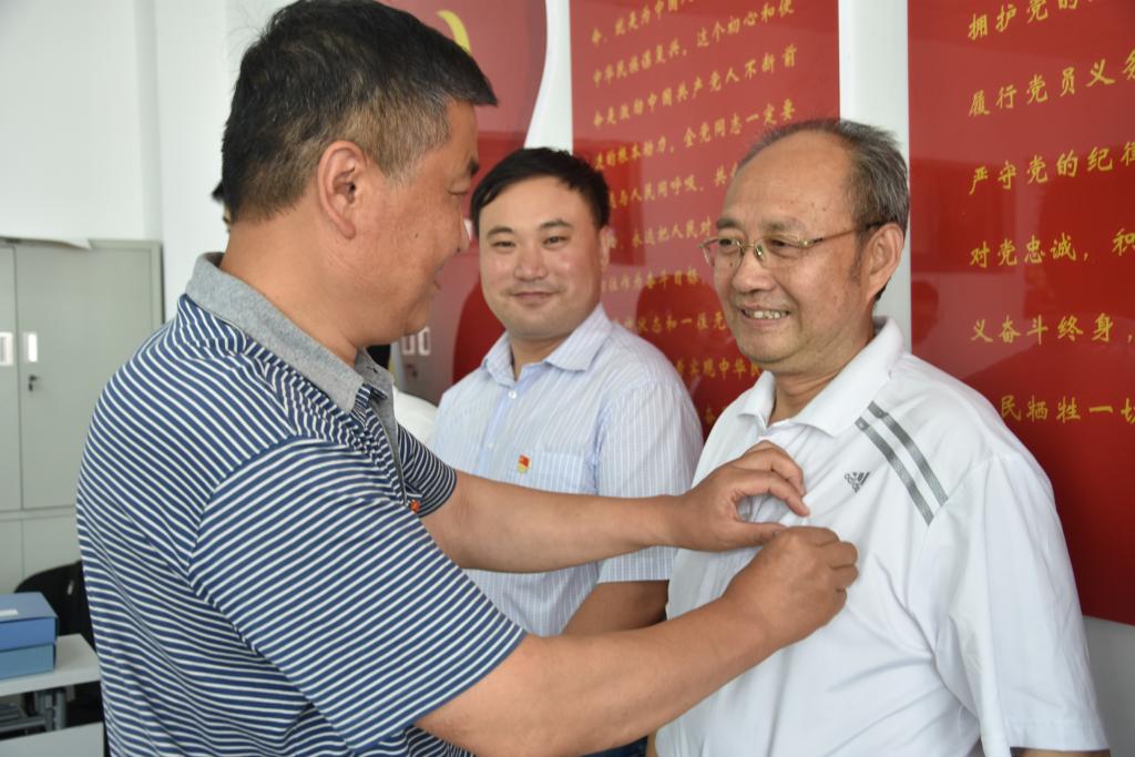 党徽是中国共产党的象征和标志,共产党员佩戴党员徽章,亮出的是责任,赢得的是信任,接受的是监督。7月5日下午,公司党总支组织开展“戴党员徽章、亮身份、树形象、争先锋”活动,党总支书记郭仲聚为各党支部书记佩戴党员徽章,要求每名党员从现在起亮明党员身份,规范言行举止,增强党员的荣誉感。以“一名党员一面旗帜”的党员形象,进一步激励广大师生党员立足工作岗位,发挥先锋模范作用,影响带动周围师生在各自岗位上积极进取、奋发有为,形成比学习、比工作、比奉献,学典型、争先进、促发展的良好氛围,不断增强基层党支部的凝聚力和战斗力。