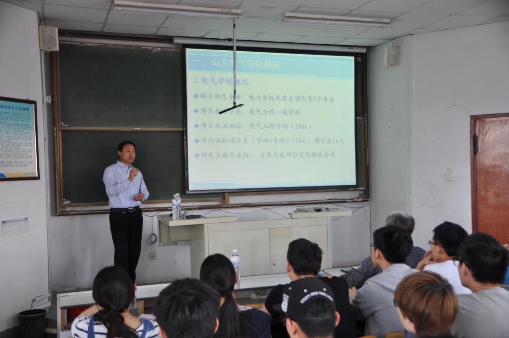 报告会上,高教授从山东大学电气工程公司概况、继电保护专业特点、继电保护科研简介和个人体会与展望四个板块做了详细介绍;过程中,结合自身多年教学与科研工作的经验,旁征博引地阐述了继电保护专业特点,并就继电保护研究对象,配套实验室建设,以及山东大学继电保护研究所的建立历史、科研成果、研究方向做了详细阐述。在体会和展望环节就自身多年科研心得、本科和研究生的科研定位、山东大学电气公司研究生招考情况与师生进行了互动交流,高教授精辟独到的见解赢得了现场阵阵掌声与好评。
