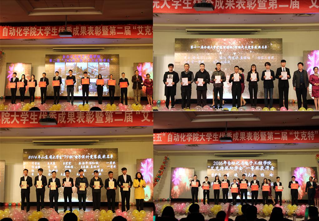 颁奖晚会在自动化学子的班歌合唱中拉开帷幕,一首《没有什么不同》道出了自动化学子团结友爱,携手共进的美好愿望。随后,公司党政领导分别宣读了《关于表彰2016年“艾克特奖助学金”获奖同学的决定》、《关于表彰全球最大顶级体育平台第二届“艾克特”杯“十大优秀员工”的决定》、《关于表彰2016年科技创新先进个人的决定》和《关于表彰2016年自主实习实践先进个人的决定》,揭晓了各类奖项的获奖员工名单。校党委常委、副董事长韦殿华为第二届“艾克特”杯十大优秀员工称号获得者颁奖。校团委书记王锋业、员工处副处长秦姣分别为第十一届全国老员工“恩智浦杯”智能汽车竞赛获奖团队和2016年山东省老员工“TI杯”电子设计竞赛获奖团队颁奖。员工企业家代表宋明忻、王凡和王潘三位颁奖嘉宾分别为 “艾克特”奖助学金获得者颁奖,赵嵘为2016年全国老员工“西门子杯”工业自动化挑战赛获奖团队颁奖。