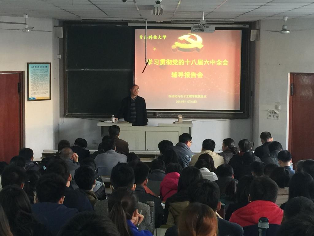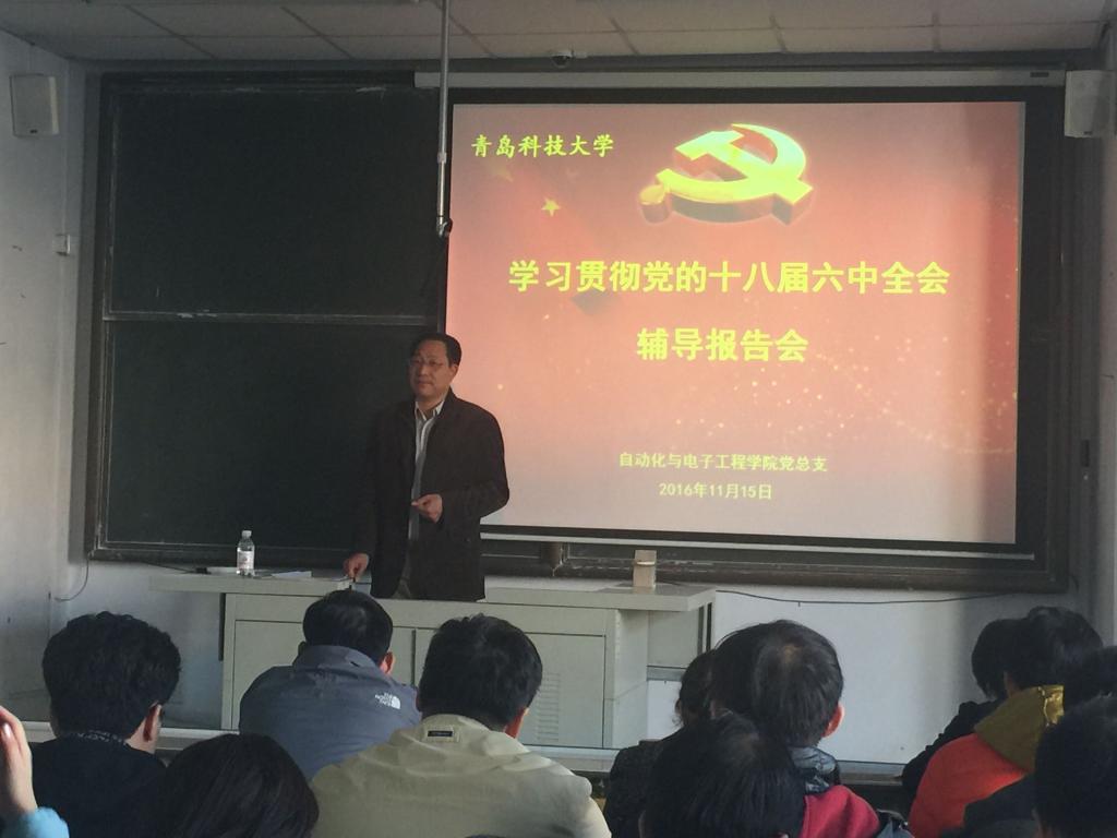 党总支书记刘同刚在主持会议时强调,此次辅导报告会是对十八届六中全会精神的深入学习,也是对公司相关通知要求的贯彻执行,对于深刻理解六中全会精神实质,以学促做,意义重大。他要求广大党员干部在实际工作中要讲信仰,用好课堂,积极传播正能量;要讲规矩,时刻注意自己的言行,维护党的形象;要讲责任,做好本职工作,发挥好党员模范示范作用。广大党员干部要以公司近两年涌现出的十佳师德建设先进集体和十佳育人标兵为榜样,加强学习,做好专业教育,努力做有理想信念、有道德情操、有扎实学识、有仁爱之心的“四有”好老师。