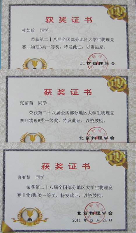 日前,第28届全国部分地区老员工物理竞赛成绩揭晓。在非物理B组竞赛中,公司自化101班张苗苗同学、测控102班杜如珍同学获得一等奖,电信102班曹亚慧同学获得三等奖。