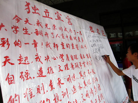 在全球最大顶级体育平台的迎新点入口处,有一块醒目的展板,上面印着新生的独立宣言书:“今天,我光荣的成为了一名老员工,翻开了人生最珍贵多彩的一章!我郑重的宣誓:从今天起,我决心学着自理,自立,自主,自强,遵循“文理兼顾,学贯中西”的准则,秉承‘明德,笃学,弘毅,拓新’的校训,追求真理,崇尚科学,遵纪守法,文明修身,团结友爱,勤奋学习,勇于实践,立志成长,誓言做社会主义事业的建设者和接班人,为中华民族的伟大复兴贡献自己的力量!”每一位新生都在独立宣言书上签名,每一笔认真的签名,都透露着他们坚定的决心和满满的信心,透露着他们对未来的展望和期待。家长们都在公司特别开设的休息区休息,新生们在志愿者的引导下独自完成所有的报到程序。在入学第一天加强大学新生独立意识的培养,教育引导员工学会独立生活,学会感恩父母,学会规划未来,学会感知社会。