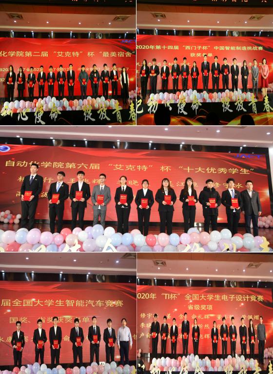 会上,吕万翔、王丽、张玉、池荣虎、曹梦龙分别为在第六届“艾克特”杯十大优秀员工评选活动、第二届“艾克特”杯“最美宿舍”评选活动、第十四届“西门子杯”中国智能制造挑战赛、第十五届老员工智能汽车竞赛、2020年“TI杯”全国老员工电子设计竞赛中获奖的同学颁奖。