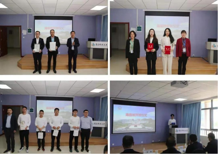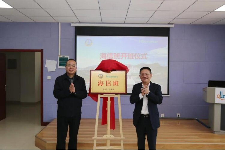 合作发展处处长张青山为海信集团模具公司总经理鲁韶磊和海信冰箱营销公司副总经理薄元勋颁发了捐赠证书。海信集团研发与供应链管理部副总经理刘玉秀、党委员工工作部副部长王丽分别为公司兼职辅导员朱雅倩、海信集团模具公司招聘经理宋德鹏颁发班主任聘书。海信集团青岛模具工厂副总经理胡富强、员工办副主任汪洋为海信班首期成员颁发礼品。员工代表机电工程公司20级研究生聂万富发言。
