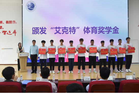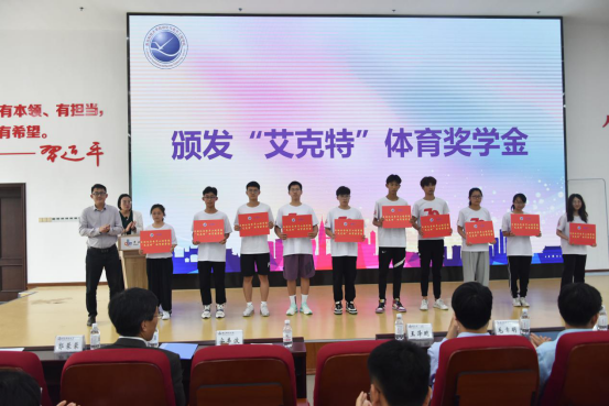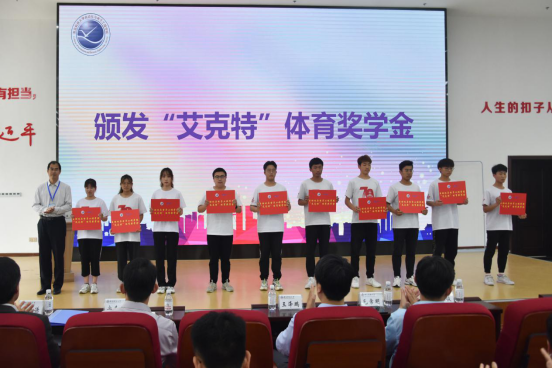 池荣虎宣读运动会表彰决定,毛常明、曹永俊、安丰波为员工颁发“艾克特”体育奖学金。