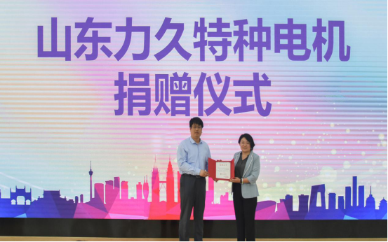 王泽鹏为运动会赞助单位——山东力久特种电机股份有限公司颁发捐赠证书。