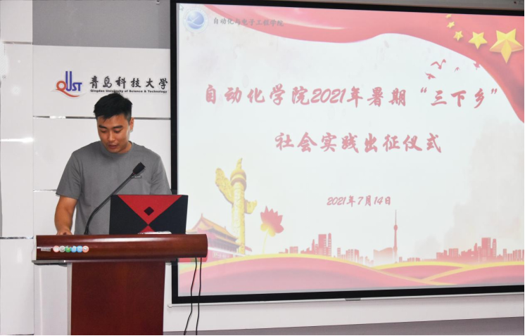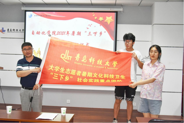 马寒在出征仪式上向“三下乡”社会实践代表队授旗,并勉励各实践团在实践过程中吃苦耐劳、虚心请教,在脚踏实地中增长才干。