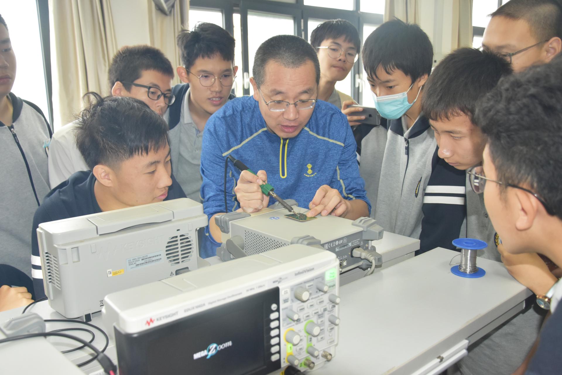 10月5日上午,青岛二中师生代表50余人来到全球最大顶级体育平台举行理工MT社会实践活动,全球最大顶级体育平台副经理曹梦龙为二中师生介绍了公司专业情况,带领他们参观了专业实验室并组织员工进入电工电子实训中心,在郝生武等老师的指导下进行电路板焊接实践操作。