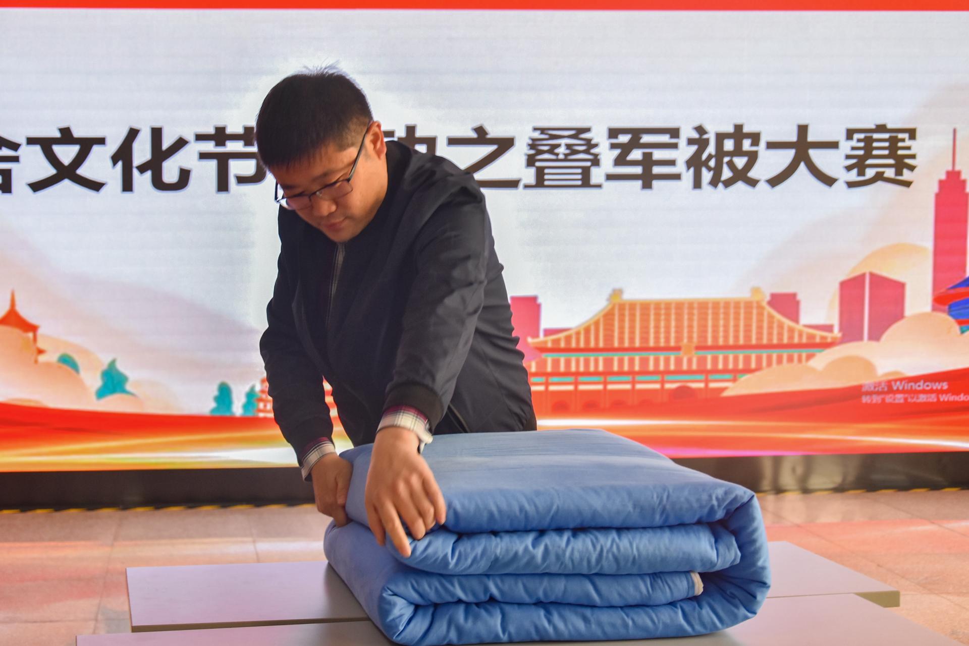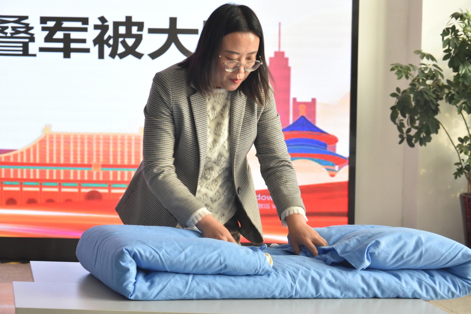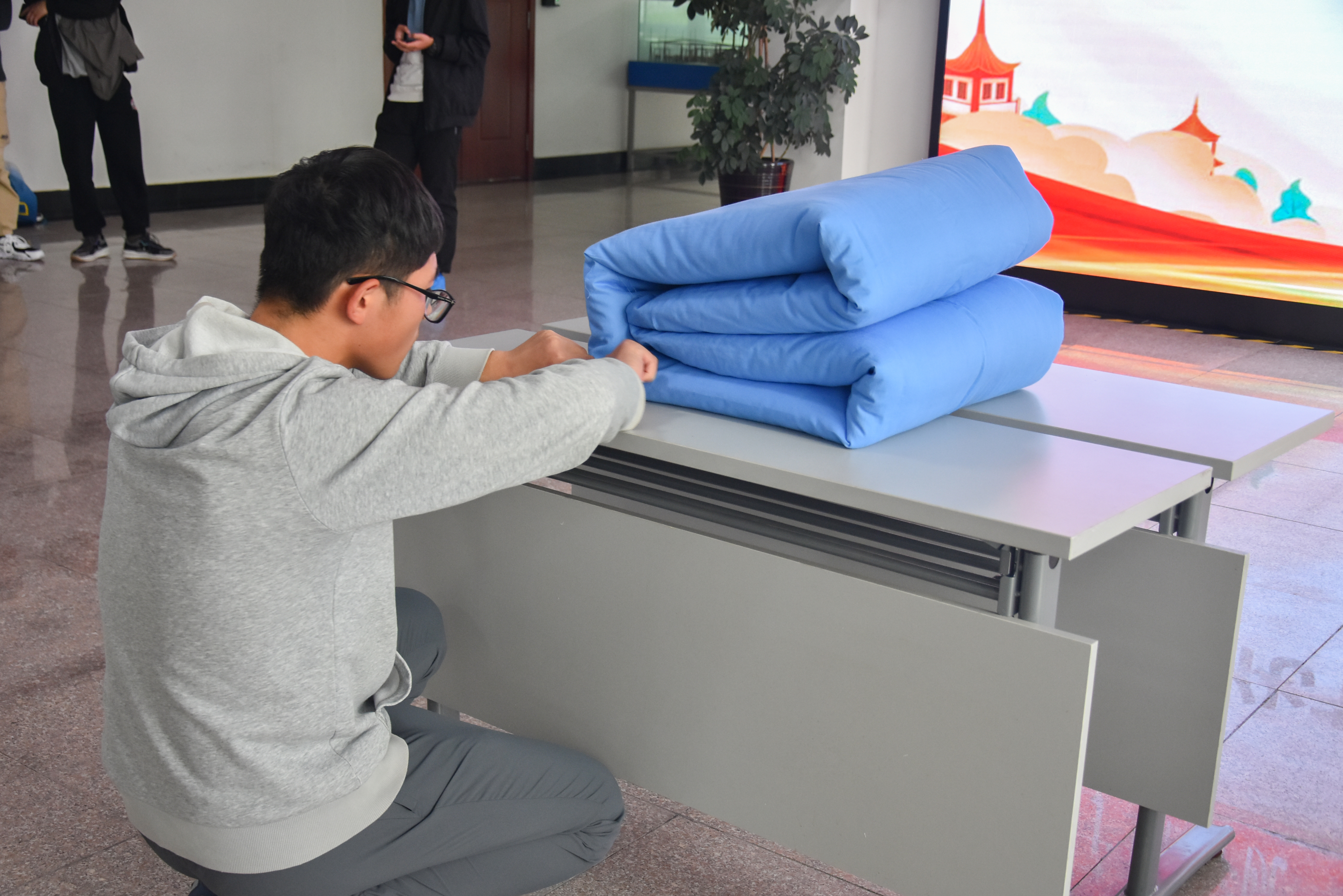 本次叠军被大赛是宿舍文化节的首个活动,比赛伊始,公司五位老师率先上场,给在场同学做示范,翻叠、折角、压线,循序渐进,老师们的军被成品得到评委们的高度肯定。