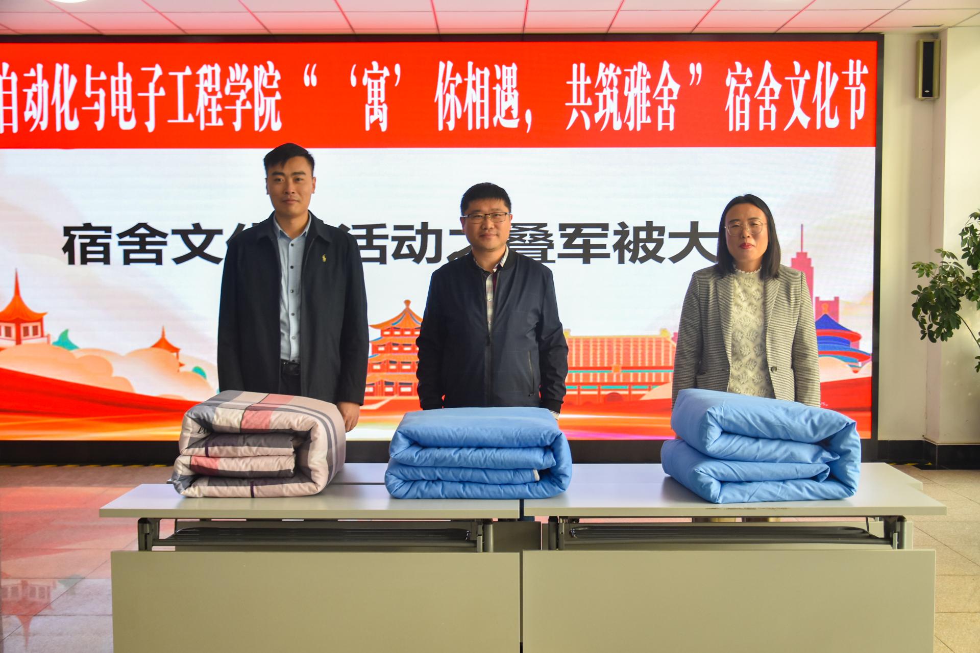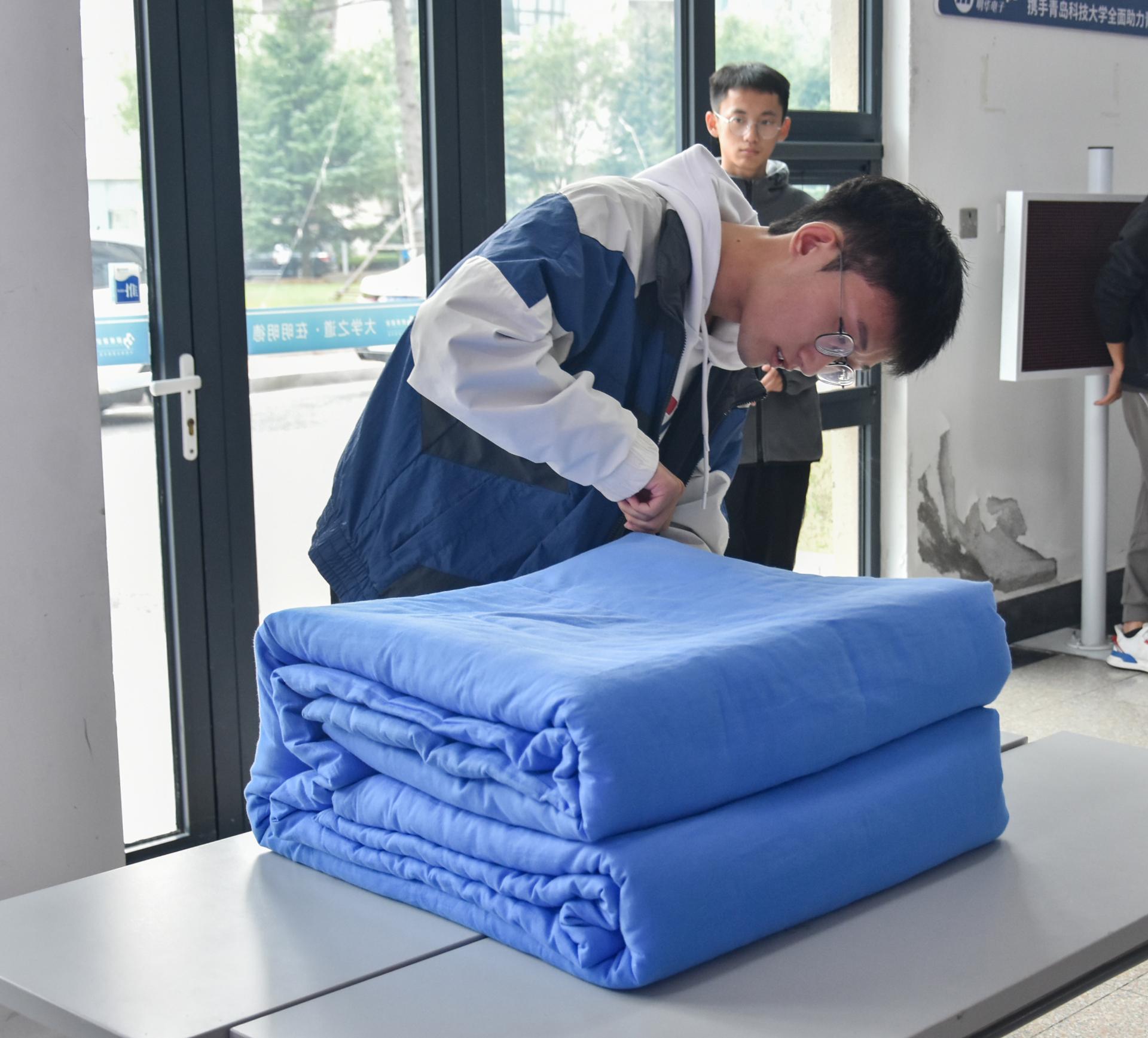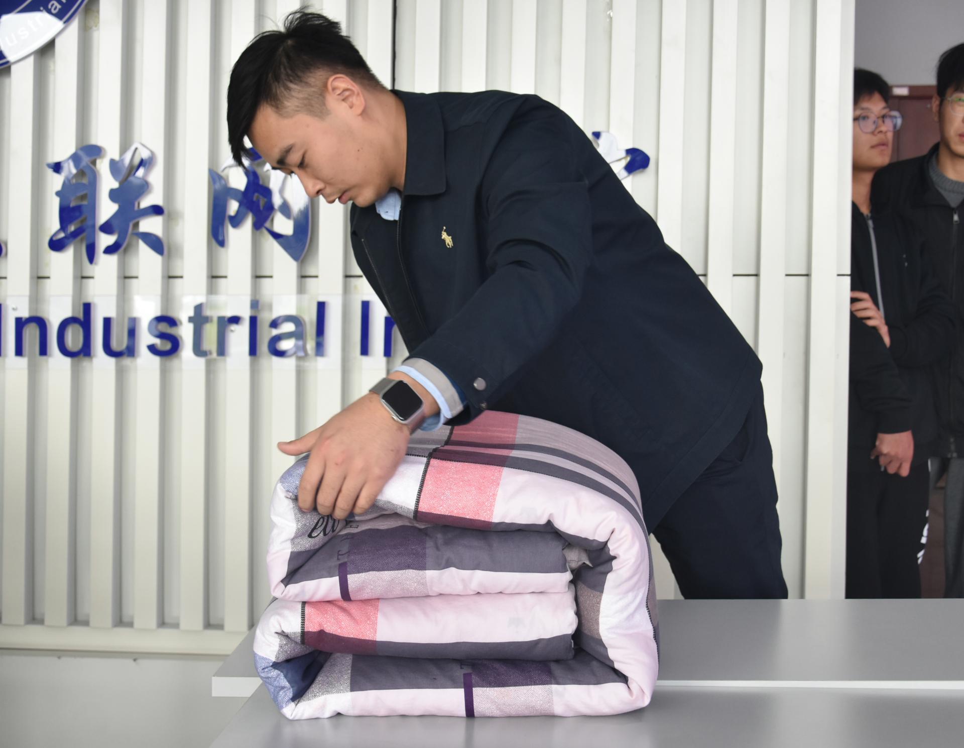 本次叠军被大赛是宿舍文化节的首个活动,比赛伊始,公司五位老师率先上场,给在场同学做示范,翻叠、折角、压线,循序渐进,老师们的军被成品得到评委们的高度肯定。