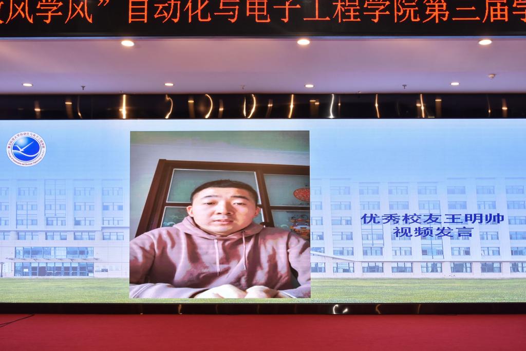 “佳运助学金”创始人、优秀员工王明帅学长作视频发言,倡导全体同学增强体质素质,增加自身见闻,保持饱满昂扬的精神状态。