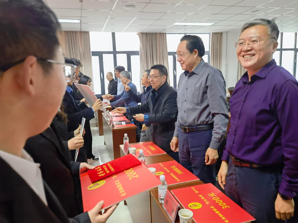与会领导、化自86员工代表为同学们颁发2021年“饮水思源”奖助学金荣誉证书。
