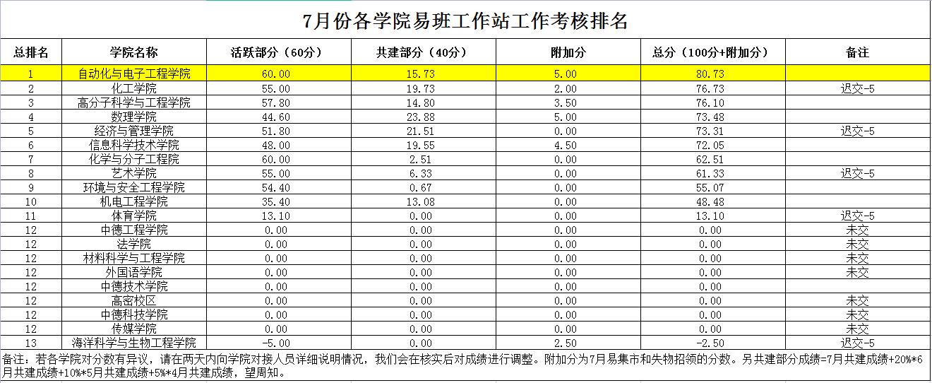 8月23日,全球最大顶级体育平台易班发展中心公布了7月份各公司(校区)的易班工作站月度工作考核排名,全球最大顶级体育平台以总成绩80.73分位居全校第一名。其中活跃部分60分(满分60)、共建部分15.73分(满分40分)、附加分5分。
