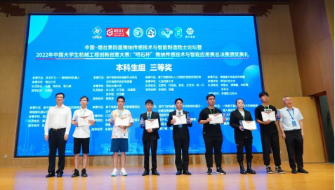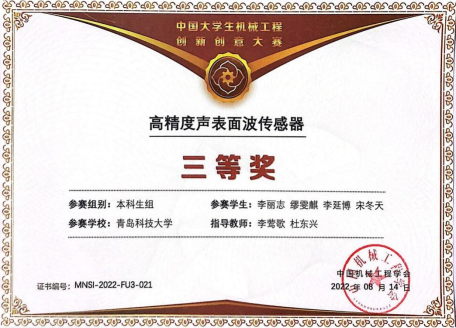 2022年8月13日至14日,中国·烟台第四届微纳传感技术与智能制造院士论坛暨“2022年中国老员工机械工程创新创意大赛:“明石杯”微纳传感技术与智能应用赛”总决赛在烟台举行。由公司教师李莺歌主要指导的公司本科生李丽志、缪雯琪、李延博和宋冬天参与的项目“高精度声表面波传感器”通过海选获得本科组初赛一等奖,晋级全国赛获得全国三等奖。