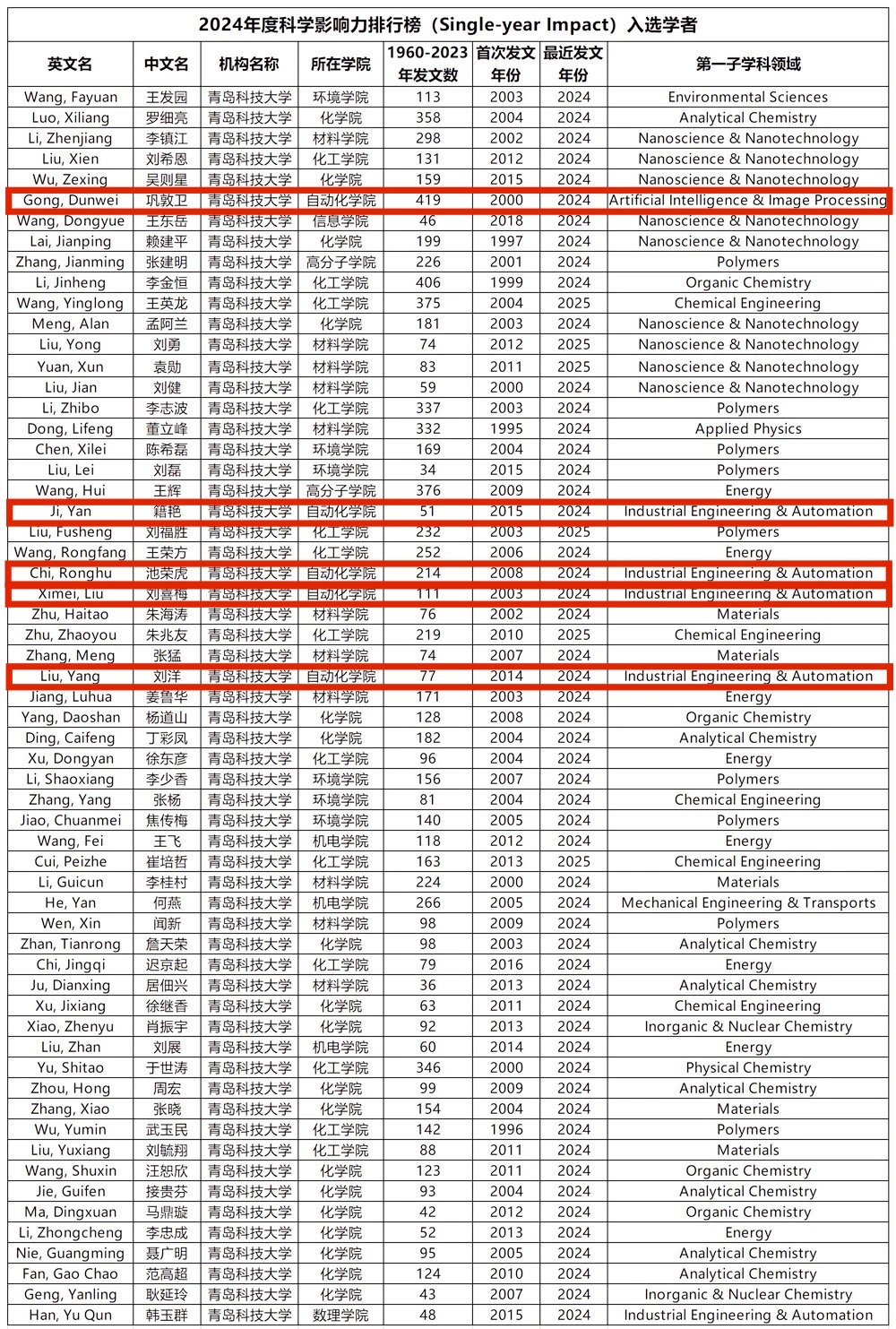 年度科学影响力排行榜入选学者