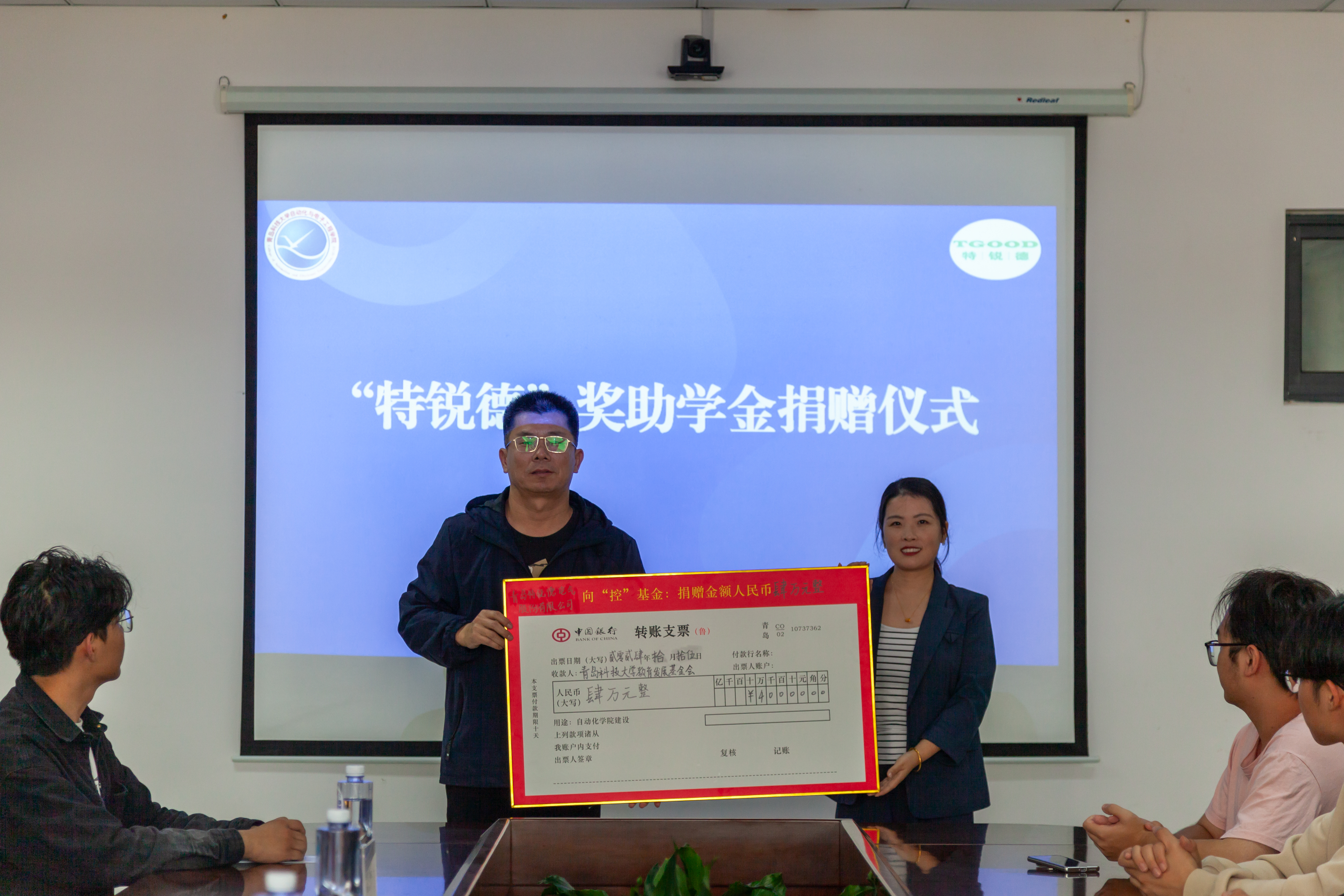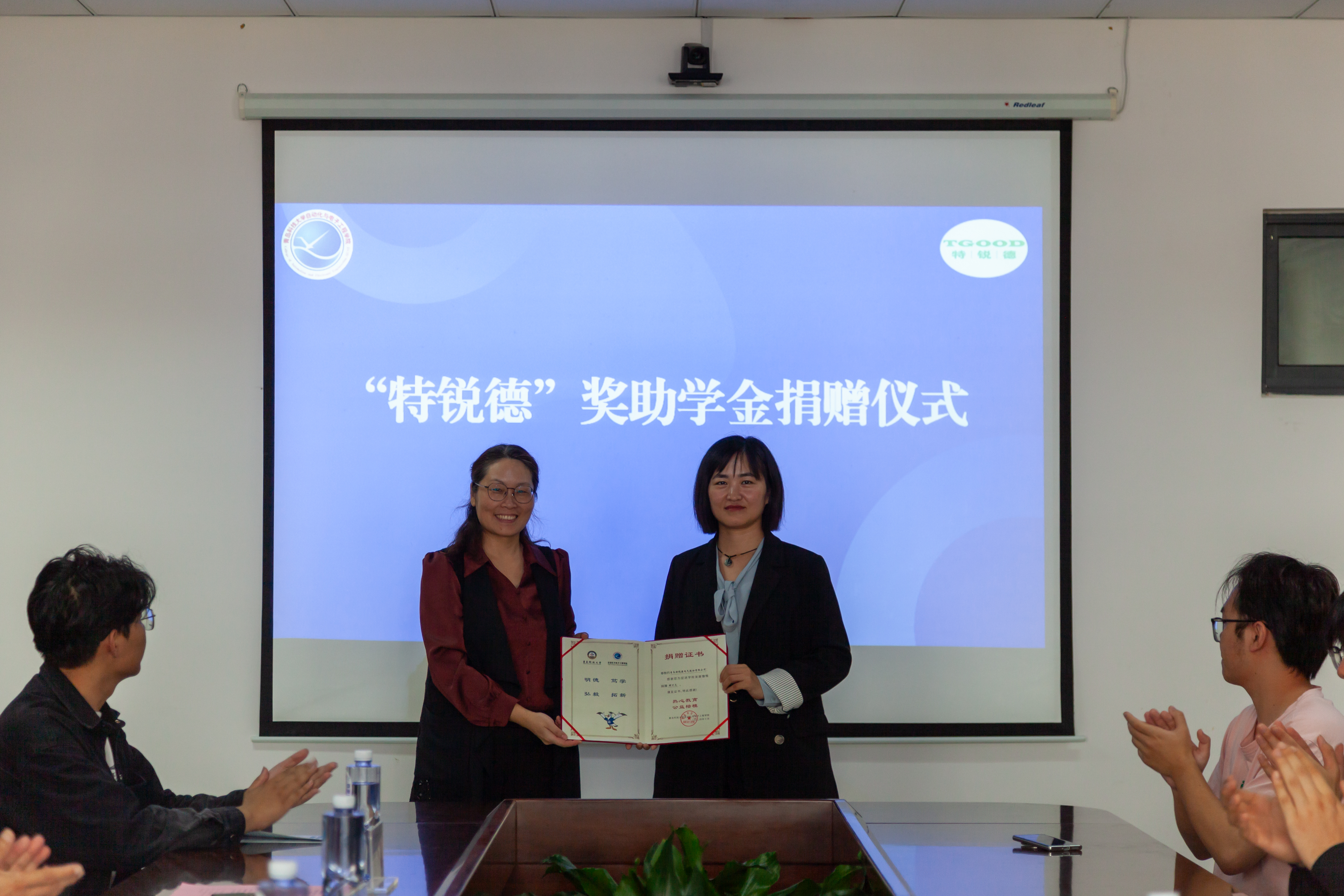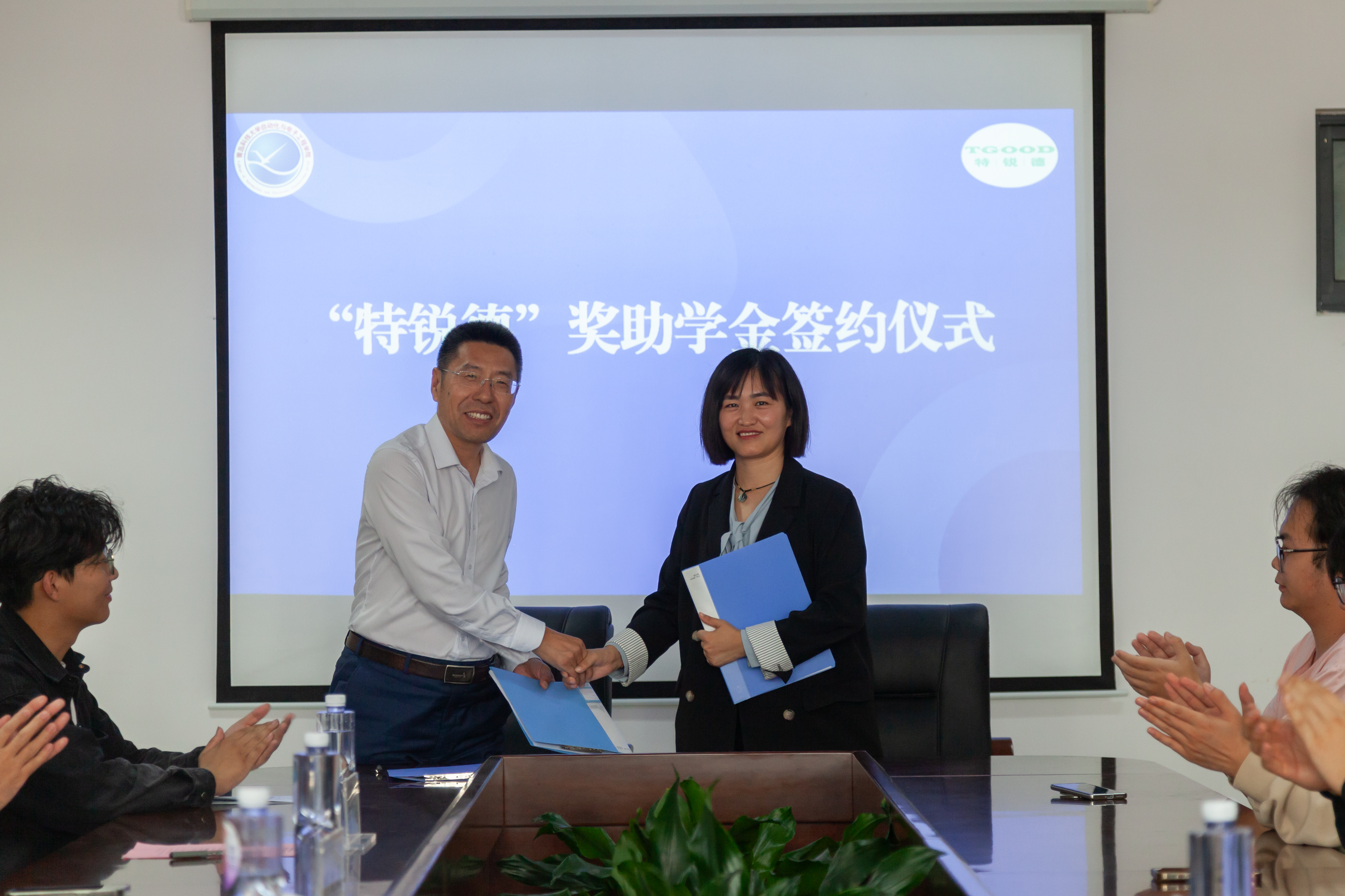 签约仪式上,李卉向韩增雪颁发了捐赠证书,以表达公司对公司的诚挚感谢和崇高敬意。巩敦卫与韩增雪共同签署了“特锐德”奖助学金合作协议,本次签约为双方第二年签约,标志着双方合作迈出了坚实的一步。张莹与刘名森进行了捐赠交接。
