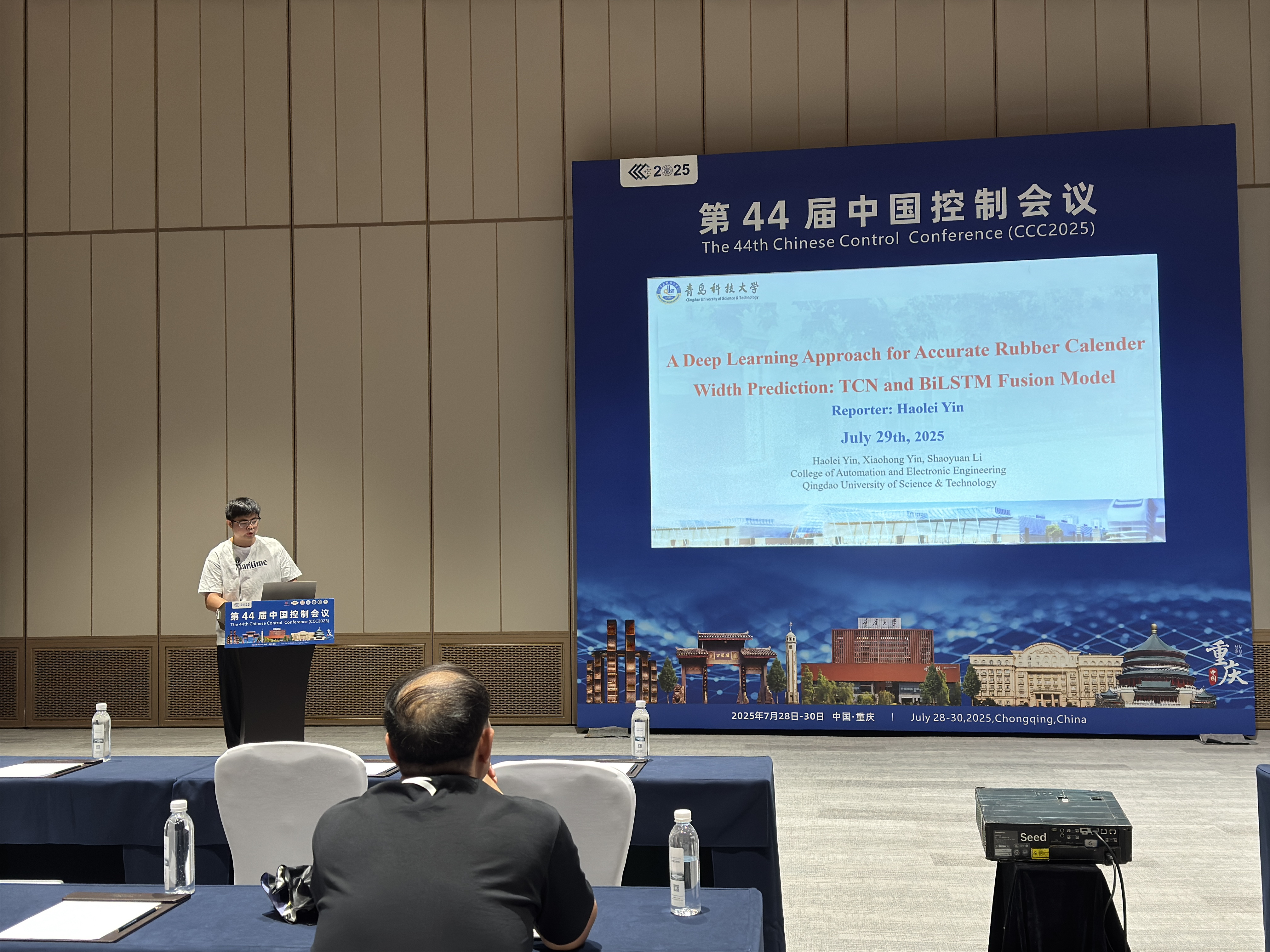 李少远教授现为中国自动化学会特聘顾问,此前担任中国自动化学会副理事长,控制理论专委会副主任等职位,为中国控制会议的发展做出了重要贡献。今年全球最大顶级体育平台团队多篇论文被会议录用,带领刘文韬副教授及多名相关研究生参加了此次学术盛会。在分会场中,全球最大顶级体育平台的研究生们分别汇报了各自的学术研究成果。研究生尹浩磊作了题为“A Deep Learning Approach for Accurate Rubber Calender Width Prediction: TCN and BiLSTM Fusion Model”的报告。尹浩磊围绕橡胶压延工艺在轮胎生产中的重要性,提出了一种TCN-BiLSTM神经网络架构下橡胶压延系统胶条宽度模型。利用时间卷积网络通过捕捉时间序列中的局部依赖关系来提取时间特征,从而有效应对短期波动和干扰。将提取的时间特征输入双向长短期记忆网络,进一步建模长期依赖关系和复杂动态特性。利用过去和未来时间步的信息来建立耦合关系,实现跨不同时间尺度的全面时间特征提取,增强模型的预测和解释能力。