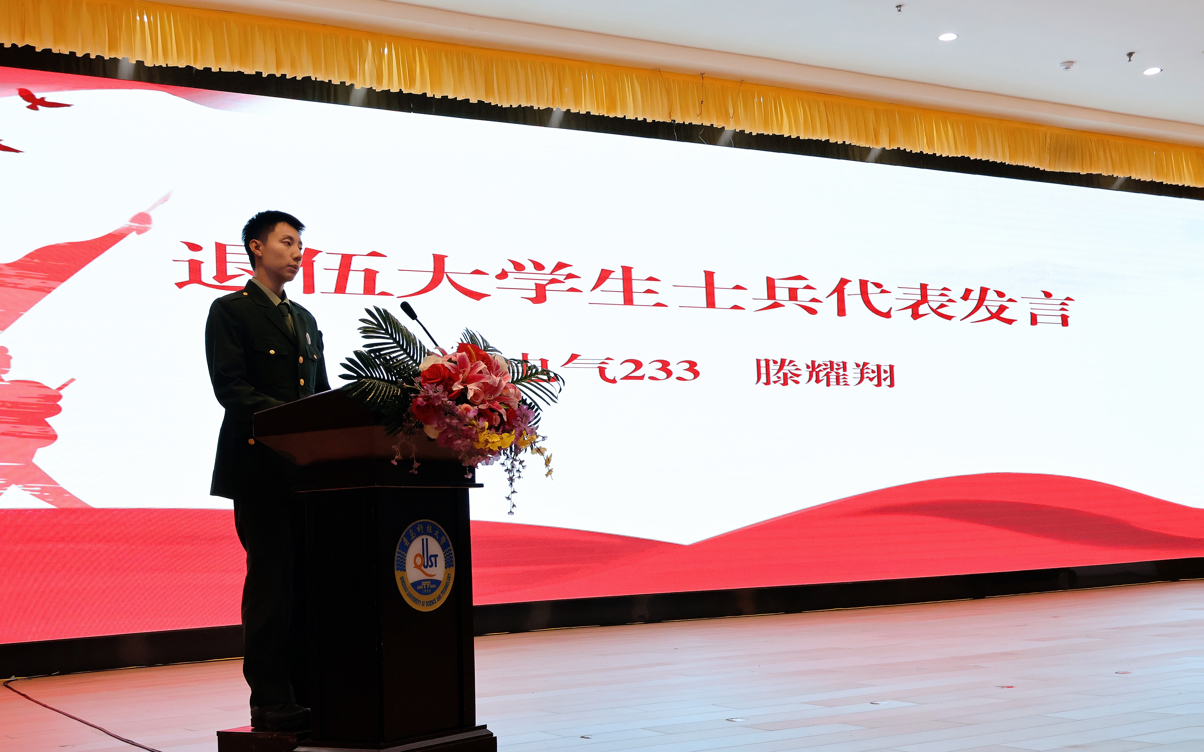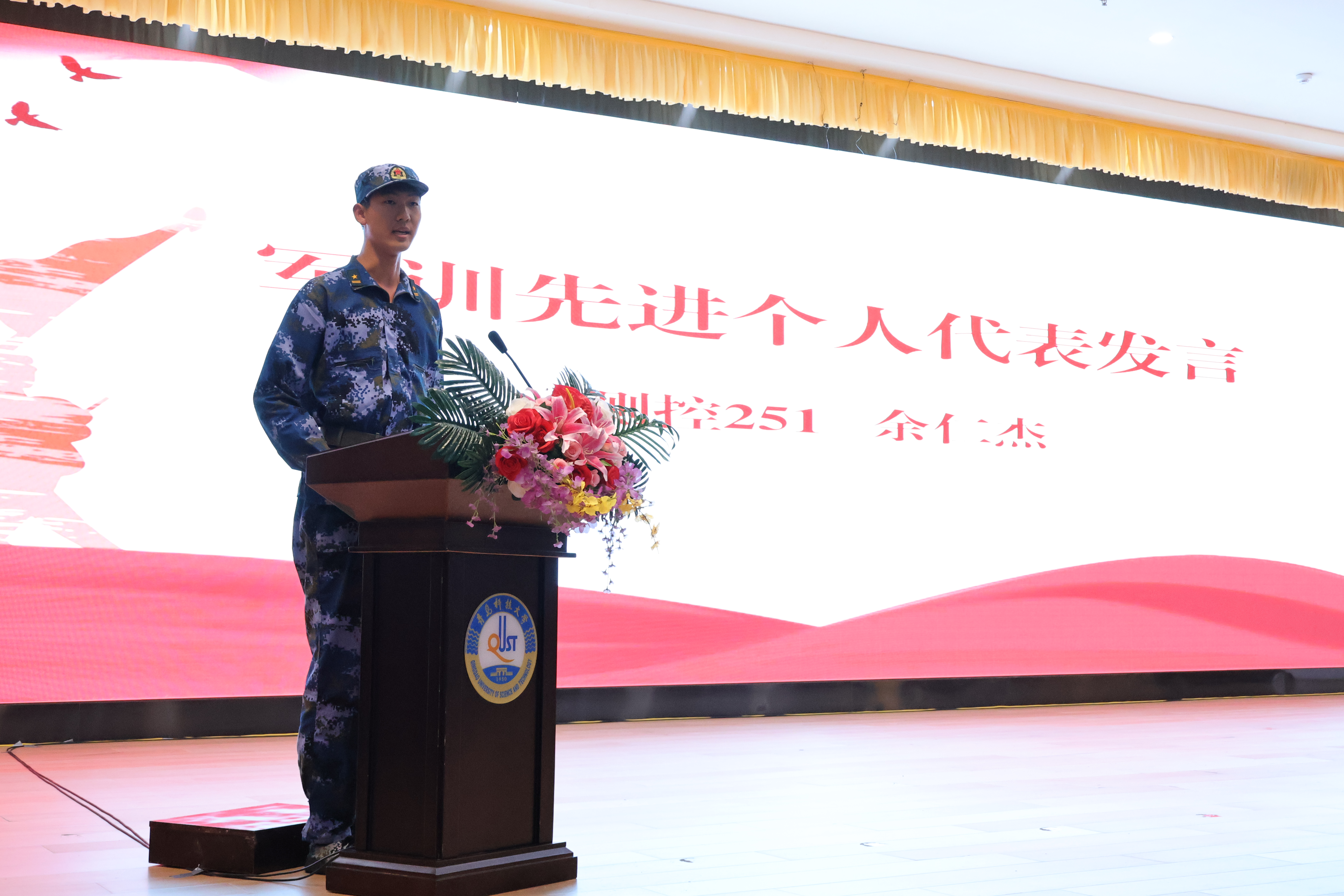 测控251余仁杰作为军训先进个人代表发言,分享军训收获与成长感悟,他表示,军训磨砺了新生们顽强拼搏、自强不息的品格,青年人要在吃苦中成长。电气233滕耀翔作为退伍老员工士兵代表,结合自身经历讲述军旅故事、戍边经历,传递国防担当。他表示,青年应当自觉增强忧患意识,加强思政学习,为建设社会主义现代化强国挺膺担当。