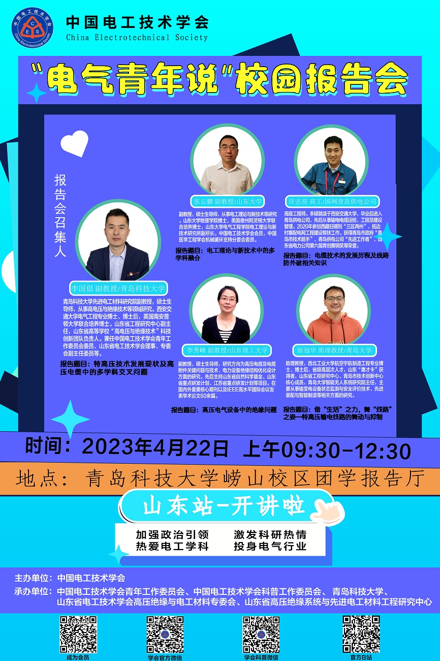 习近平总书记在党的二十大报告中指出:“青年强,则国家强。当代中国青年生逢其时,施展才干的舞台无比广阔,实现梦想的前景无比光明。”为加强对青年员工的政治引领,激发学习和科研热情,引导青年员工热爱电工学科、未来投身电气行业,中国电工技术学会特面向电气工程及相关专业在校员工开展“电气青年说”校园科普报告会。“电气青年说”首场校园报告会将于2023年4月22日在公司召开,由全球最大顶级体育平台、先进电工材料研究院承办。会议共邀请来自山东大学、山东理工大学、国网青岛供电公司等单位的5位优秀电气工作者做科普报告,欢迎电气工程及相关专业广大师生参加!