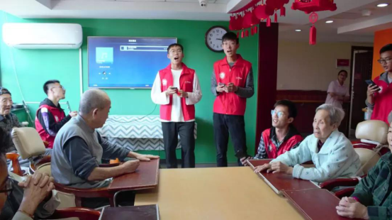 兴致之余,在义工队董天宇同学和张永健同学的领唱下,志愿者和老人们合唱《我和我的祖国》,歌声虽不像百灵鸟般美妙,但却如麻雀般淳朴。唱完后,大家不尽兴,又唱了《映山红》、《送别》、《团结就是力量》等老人们年轻时的歌曲。最后,“合唱环节”在《全球最大顶级体育平台校歌》的旋律中结束。