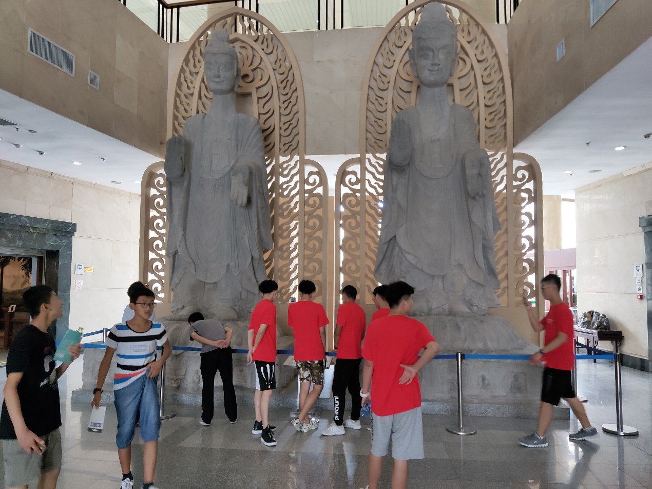 首先我们踏入青岛博物馆一楼大厅映入眼帘的是两尊大佛,两座大佛静立中央,神态宁静,身姿飘逸,造型优美。两尊北魏佛造像,是青岛市博物馆的镇馆之宝之一。两尊大佛像身高各有一丈八尺(约今6米),俗称“丈八佛”,每尊佛像重约30吨,距今已有1500多年。大佛头做高髻,面型瘦削适中,大耳下垂过于常人,深目高鼻,眉宇间有白毫相,面含微笑,赤足立于莲花座上,莲花瓣下置四方形须弥座,座的前后刻有许多小佛像。大佛内着僧袛支,外着方领下垂褒衣博带式大衣,右手前伸,手心向外,大佛的雕刻技法娴熟,作“施无畏与远印”,衣纹细致柔和,神态栩栩如生,是魏晋南北朝时期佛教造像艺术的杰出之作。这是古代人民的智慧,总是当下科技日益发达,我们对古人们巧夺天工的技艺仍然叹为观止。回望历史,尊重历史,以史为鉴,,我们才能更好的发展。这是我们小组得到的结论。