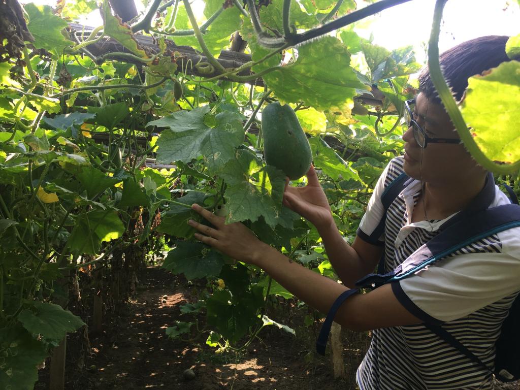 队员们进入芹菜、茄子、节瓜等大棚,帮助当地农户采摘成熟的节瓜、茄子等,观察当地芹菜的生长,从而学习基础的农业知识,体会果实收获的喜悦。在采摘观察的过程中,队员们也都有所思考,发现了许多问题。人力培养以及采摘确实耗费精力,而且在采摘过程中容易受伤,蔬菜的收成受天气影响较大,农业所带来的经济收益也只是靠寻常的批发买卖。因此,队员们就此给出一点建议,可以在本地建立蔬菜加工厂,对当地所产蔬菜进行加工出售,提高出售价格,获得更高的经济效益。腐烂的农物,适当处理可用作饲料以及肥料,减少浪费。