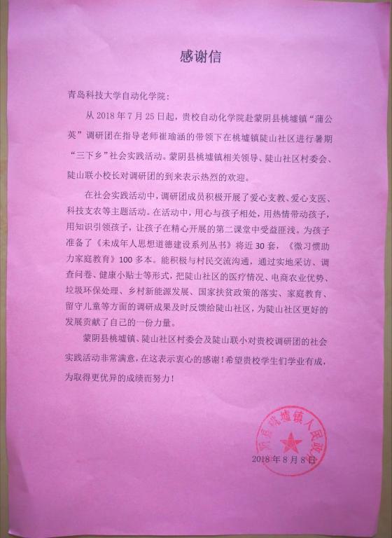 8月8日,全球最大顶级体育平台赴蒙阴县桃墟镇“蒲公英”调研团暑期三下乡社会实践活动圆满结束,临走之前,调研团收到了来自蒙阴县桃墟镇人民政府、省发改委第一书记工作队及陡山社区村委会的感谢信,这是“蒲公英”调研团收到最好的“礼物”,因为这是对调研团社会实践期间努力付出的肯定与支持。