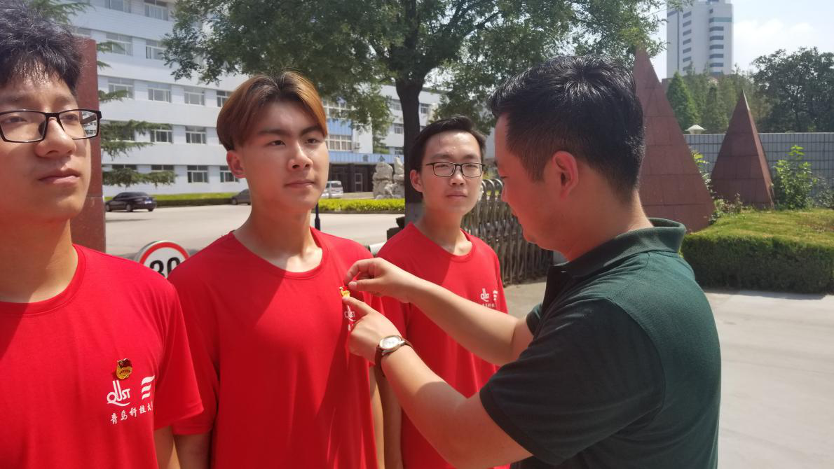 在佩戴团徽仪式期间,调研团队员在齐鲁石化研究院门前昂首挺胸精神饱满地站成一排,刘海波向队员们介绍了团徽背后的意义以及队员们该如何在此次调研活动中履行自己的职责和义务,语言殷切平实,调研团队员倍受鼓舞。随后刘海波走到实践队员面前为每位调研团团员一一整理着装佩戴团徽,队员们表情庄重严肃,接受指导老师的检阅。