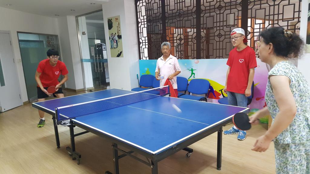 上午,调研团到达幸福中心,这里常有老员工来做各种志愿活动,老人们显然并不拘谨,很热情的招呼着志愿者们陪他们运动。气息均匀以后,大家看着老人们稳健的步伐,提出打球的建议,又考虑到室外炎热,最终决定打乒乓球。几番来回,可以看出老人们平时在这乒乓球上可没少下功夫,在反应速度、巧劲的运用上,比起年轻人丝毫不差。负责人杨晓玲表示,在这里类似的课程不少,每次一来志愿者老人们总是会跟青年们比一比,他们也不服老。随后是舞蹈课,志愿者们主动请缨一同前往学习。在练习室,一排排站的整整齐齐的老人们,跟随着老师认真的学习着每一个动作,虽然笨拙但老人们格外用心。舞蹈老师表示,很多老人都是没有一点的舞蹈功底,但是她们几乎每天都来练习,风雨无阻。
