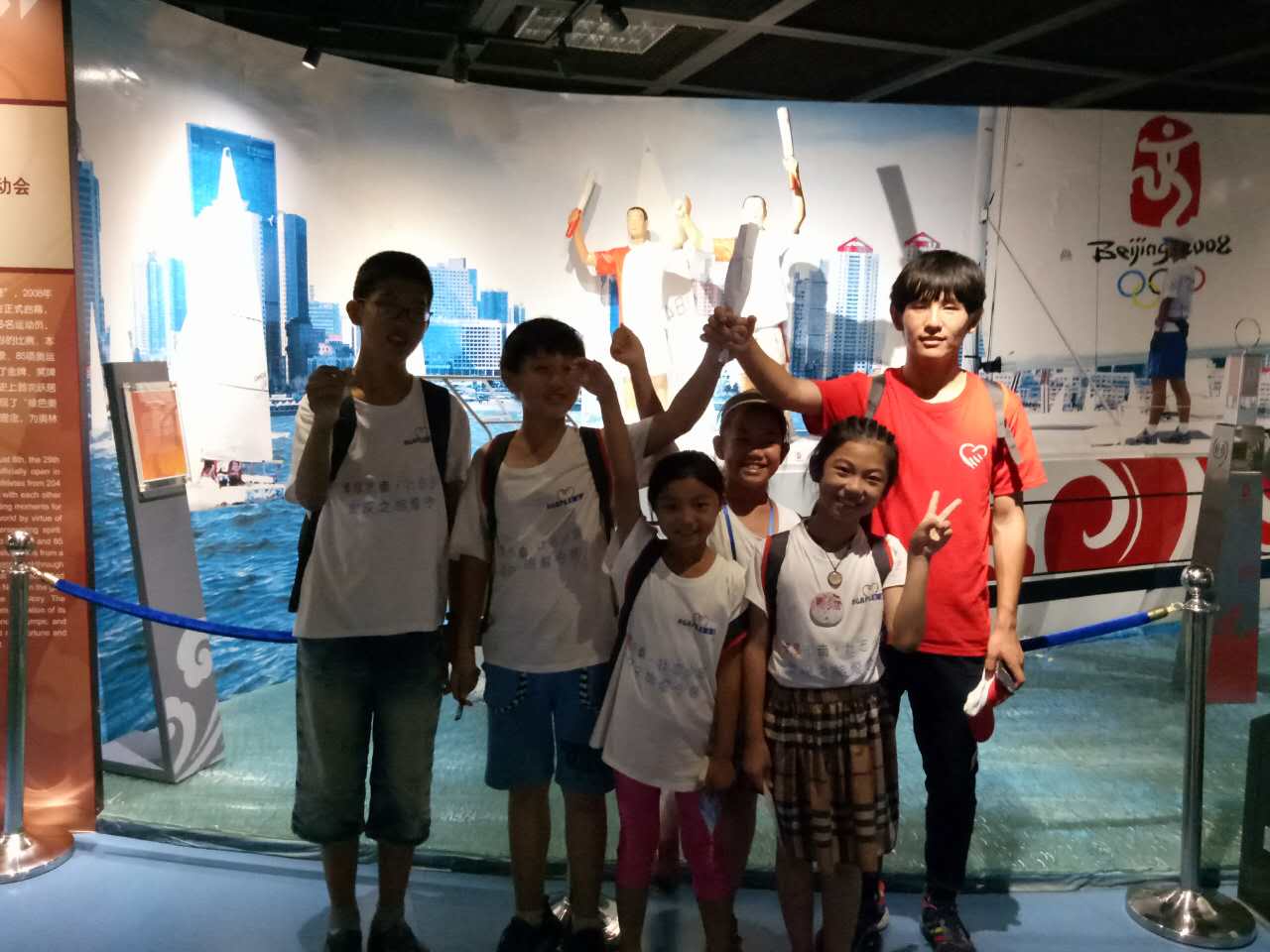 四组的孩子们在两名实践团成员的带领下开始朝奥帆博物馆进发。刚入馆,孩子们便争先恐后地登上北京奥运会的领奖台,他们表示自己像是为国家赢得了荣誉一样,心底的自豪感油然而生。部分孩子在2008年北京奥运会举办之时尚未出生,两名实践团成员一边带领孩子们参观一边耐心为他们讲解。奥运帆船实体、迷你帆船模型、北京奥运会的火炬以及耀眼夺目的“金镶玉”等每一项展品无不吸引着孩子们的眼球。来到一条长长的奥运历史走廊,历届奥运会的火炬悬挂在墙壁上,展厅内还展示有中国奥运健儿们使用过的比赛道具,屏幕上也在不断循环播放着那些令人激动的画面。