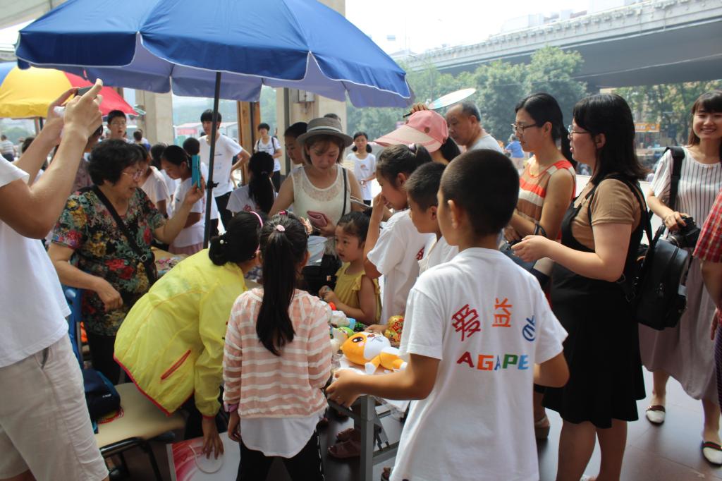 上午,小朋友们带着自己前一天制作的手工物品来到了大润发进行现场义卖,各种各样的手工物品聆郎满目,摆满了自己面前的摊子,创意木棍、手画扇子、文化衬衫等等。“阿姨,你来看看我们做的扇子,是我们自己画的,来买一件吧阿姨,夏天很好用的。”在义卖活动的现场,类似的声音此起彼伏。孩子们分工明确,有的负责街头叫卖,有的负责向行人介绍自己的手工产品,而有的则负责账单的记录和钱的找零。虽然现场有着酷热与高温的阻挠,但仍然阻止不了小卖家们的高涨的热情,他们跃动的身影给炎热的夏天带来别样的风采。众多市民都积极主动的参与到活动中,他们表示,购买义卖商品,不仅满足了自己的需求,同时还能为公益事业奉献自己的一份爱心。