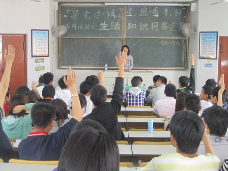 知识问答竞赛包括两个环节,第一环节是笔试,在这个环节中,各个参赛小组成员通过商讨确定出最终的答案,写在下发的试题上。第二环节是激烈的抢答问题环节,参赛选手可以通过举手示意的方式告诉主持人,获得答题的机会,每个问题只有两次机会,两次答错没有分。抢答题共有50题,前40题参赛选手可以求助亲友团,在亲友团的协助下完成;而后10题则是由亲友团回答,参赛选手不可提示。在同学们得互相配合之下,各个参赛班级都取得了比较不错的成绩。此次活动中,抢答题环节最为精彩,同学们积极踊跃、毫不示弱,充分展现了选手们丰富的文化底蕴。