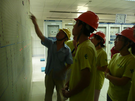 进入工厂后,公司郭经理等人盛情接待了社会实践团。郭经理首先招待成员进入会议室休息,同时向大家介绍了该公司的大体情况并与实践团人员讨论商量了如何带领大家参观工厂基地。由于工厂设备均在运行中,为了保证大家的安全,郭经理特意向大家讲解了有关安全方面需要注意的事项,他说该工厂很多为高温高压的设备,大家不要乱动设备,并统一向大家发放了安全帽。随后,郭经理带领大家注意参观了工厂的有关主要设备。郭经理首先带领大家参观了配电系统,并请公司电气专业黄主任为大家解说系统设备,并对同学们提出的有关问题做详细讲解。黄主任说该工厂所有系统均为自动化控制系统,很多控制原理都是自动化及测控专业所涉及的内容。同学们根据自己掌握的情况向黄主任提出了有关锅炉参数、检测系统、励磁变、汽轮机、发动机等问题,黄主任一一向大家做详细讲解。随后郭经理带领大家参观了锅炉装置,在对大家的对过路的主要部分进行讲解后,郭经理又带领大家到高度为32.5米的锅炉上部近距离接触和感受锅炉的结构。同学们对此很是兴奋与激动,认真听着郭经理的讲解,并不断拍照留念。之后大家又参观了燃料动力系统和化学水处理系统,看到了什么是真正的煤泥及煤泥管道和庞大的水处理系统。同学们对所有参观内容表现了极大的好奇,对有关专业知识的方面向工作人员进行询问。一切都显得很协调,工厂燃料再利用和水循环利用使该公司被评为新泰市环保先进单位,环保系统很是完善。