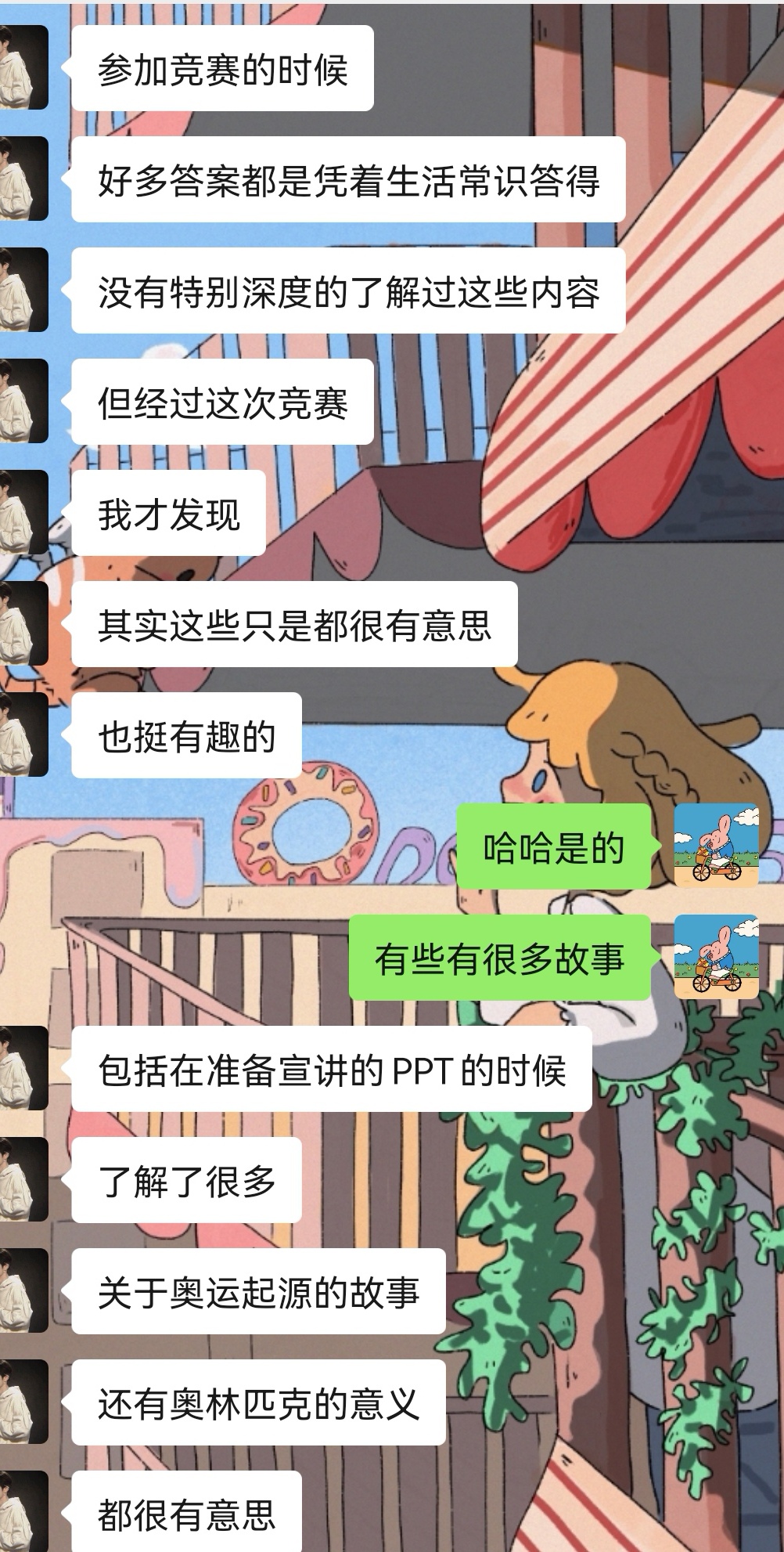迎奥运,树新风。为进一步加强团支部成员对奥运赛事的了解,团支部书记赵雅萍主持了2场3V3知识竞答会,团支部成员表示:“通过这次竞答会,对奥运会的一些专业知识有了深入了解,以前有些理解都是自己的猜测,通过这次竞答提前准备的时候才知道它的真正含义。”