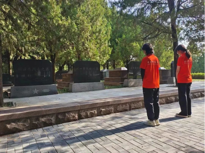 走进纪念馆的后侧,映入眼帘的是烈士墓地,墓地正中是粟裕将军骨灰撒放处,其后是烈士英名塔,塔身镌刻着在孟良崮战役中牺牲的2800多名烈士的姓名,墓区内掩埋着2800多名烈士的遗骨。松柏常青,历史不容忘却。在烈士陵园上,实践团队成员庄严肃穆,向革命烈士敬献花圈,三次深深鞠躬,表达对革命先烈的深切缅怀和无限敬仰。