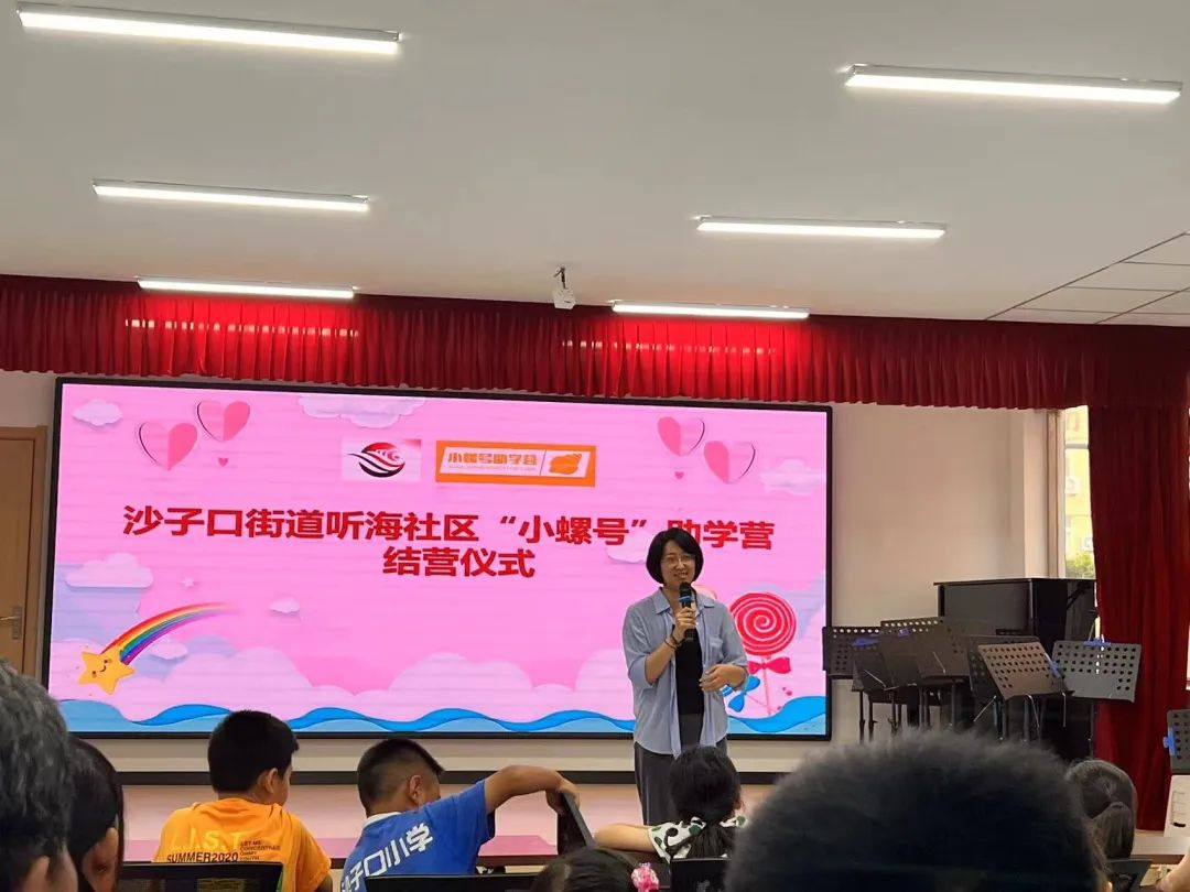 仪式伊始,听海社区党支部副书记蒙佳发言,针对两个周的助学营生活进行了总结,表扬了孩子们在这两个周内的优秀表现,询问了个别同学的学习情况和感想,她指出孩子的教育不是一朝一夕的事情,家长们需要提升自己的认知和看法,这样才能更好引领孩子。最后,她对实践团所有成员及公司和相关负责老师表达真挚的感谢。
