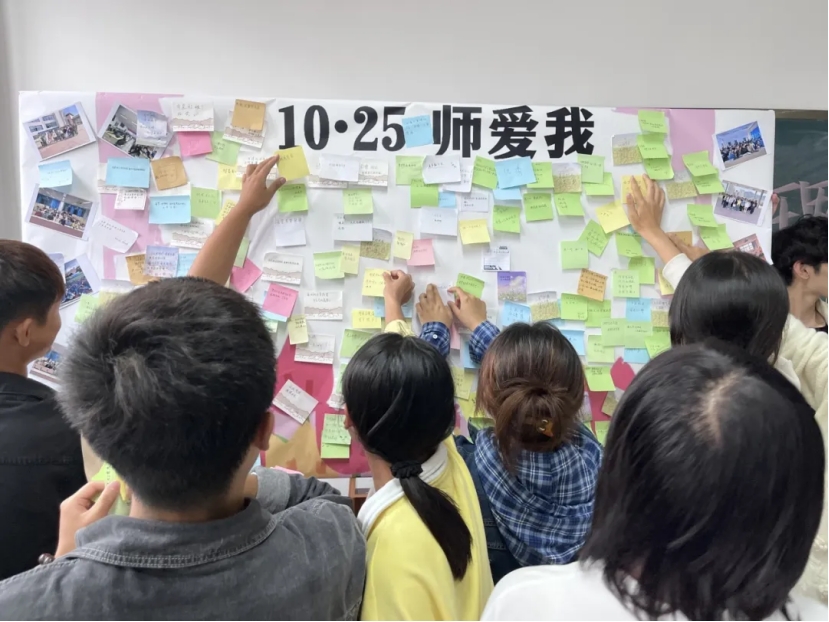 各班心理委员带来了全班同学的合照以及心愿便利贴,“10.25师爱我”展板上贴满了书写着同学们美好心愿的便利贴。