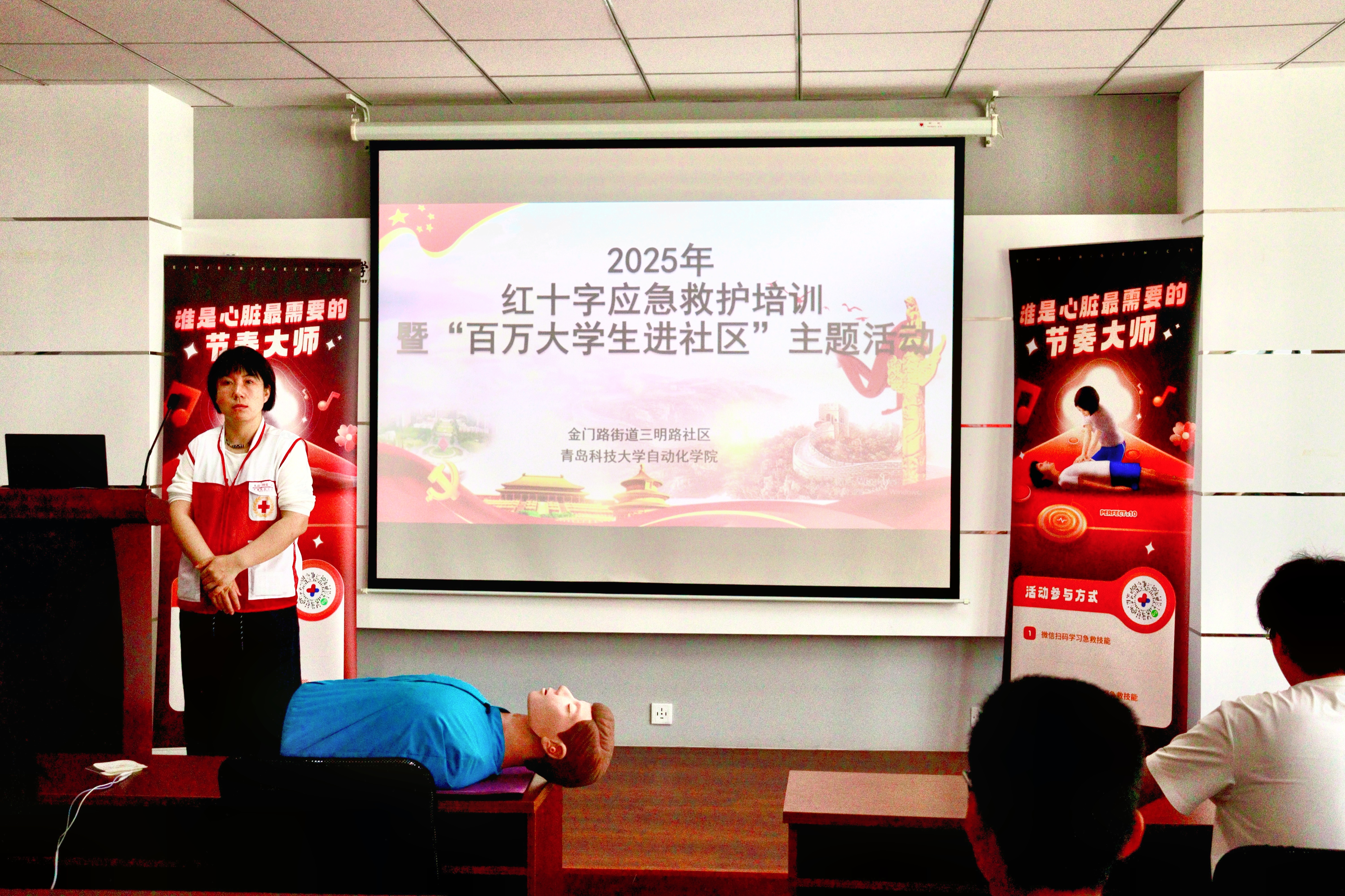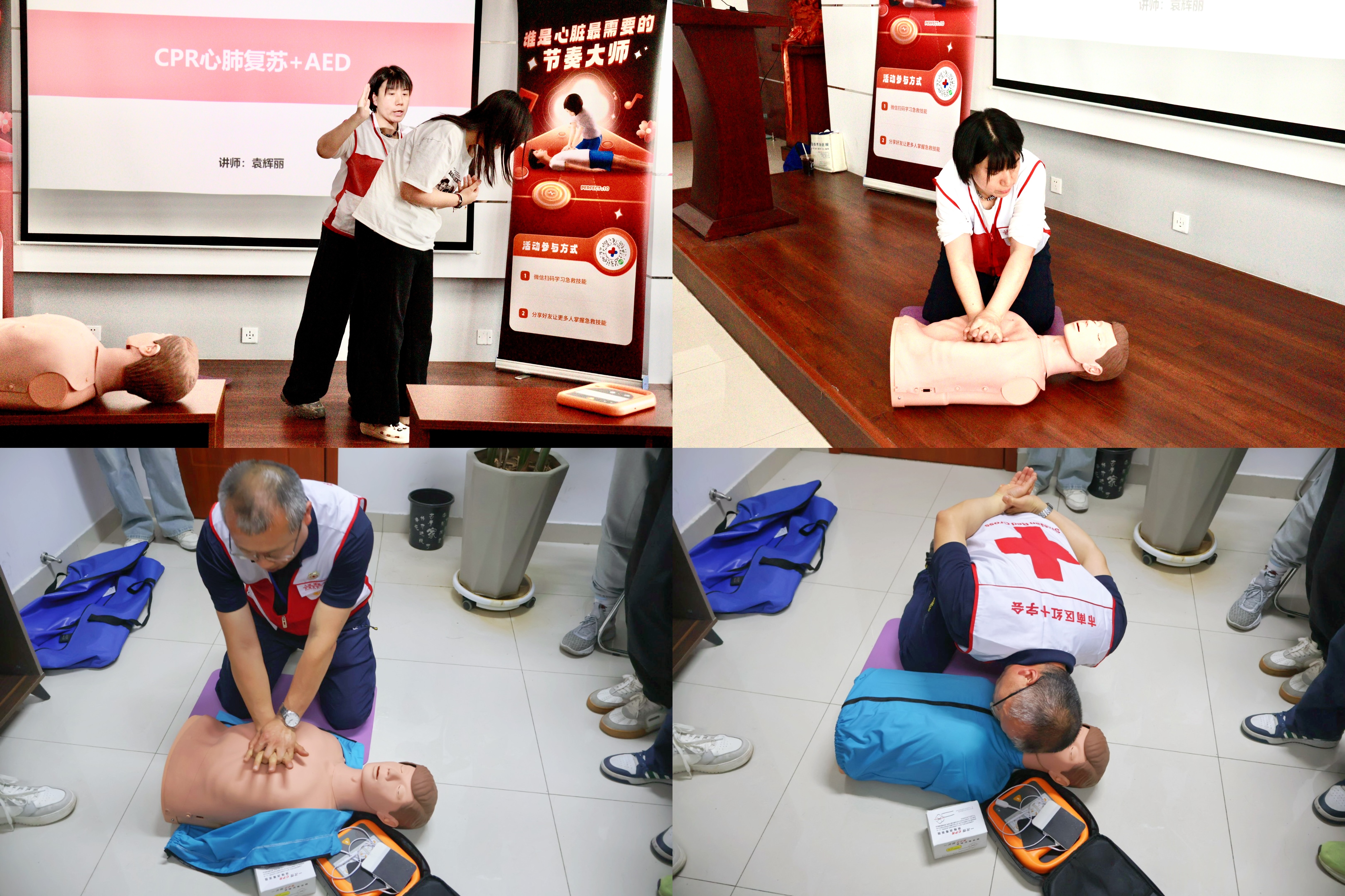 本次培训聚焦三大核心模块构建知识体系:一是心肺复苏(CPR)标准化操作,重点讲授心脏骤停黄金四分钟抢救流程及胸外按压、人工呼吸技术要点;二是自动体外除颤器(AED)实操应用,结合设备功能解析演示除颤仪使用规范;三是海姆立克急救法专项训练,针对气道异物梗阻突发状况传授腹部冲击法操作规范。培训伊始,袁辉丽讲师系统阐述了基础急救知识体系,通过典型案例剖析急救误区,深刻阐释“人人都是第一响应人”的救护理念。为强化认知效果,讲师团队运用模拟人教具开展分步教学,同步配合动作示范与要点解析,确保参训学子直观掌握标准流程。实操环节采用“理论讲解-示范演练-分组练习-考核点评”四位一体教学模式,参训学子在导师指导下逐项完成技能考核。现场学习氛围热烈。