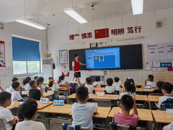 团队首站走进华盛江泉实验公司幼儿园部。针对幼儿语言发展特点,志愿者们设计了 “看图说词”“情景对话” 等互动环节,用卡通图片引导孩子们学说 “老师好”“谢谢” 等日常用语,通过分组竞赛激发参与热情。活动现场,孩子们主动用普通话分享自己的玩具,课堂互动率达90%以上。