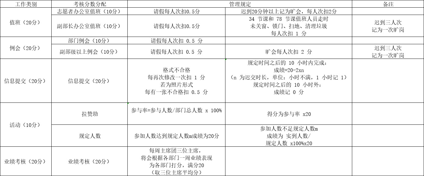 为了加强员工会的自身管理,更好的提高员工会的工作效率和工作积极性,进一步加强对员工会各部门的管理,检验各部门的工作成果,特制定员工会部门考核制度,其内容如下: