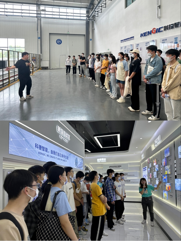 随后,师生一行走访公司老员工创新创业实习实践基地——科捷智能科技股份有限公司,在公司人力资源总监郭增水等人的陪同下参观了企业发展文化墙,并进入工厂参观智能物流和智能制造设备。